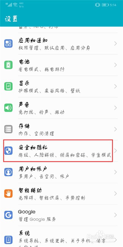 进入手机的【设置】,下拉找到【安全和隐私】点击进入