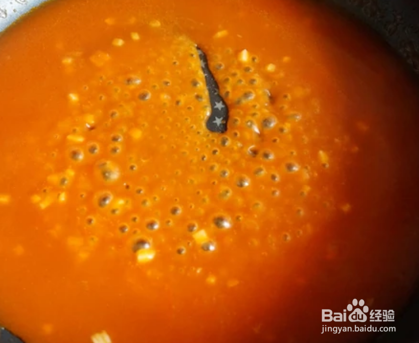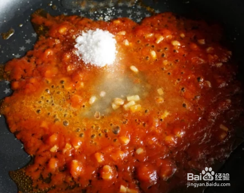 干净的不粘锅内倒入少许食用油,烧热后,加入番茄酱、白砂糖、食盐、鸡精、香葱、生姜和少许清水,大火烧开。
