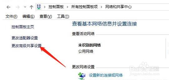 2、进入到【网络和共享中心】后,再点击【更改高级共享设置】。