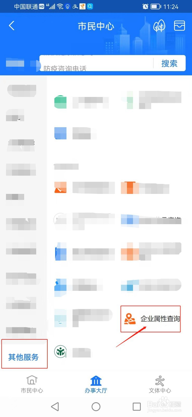 在办事大厅,我们选择其它服务里面的【企业属性查询】功能,点击进入。