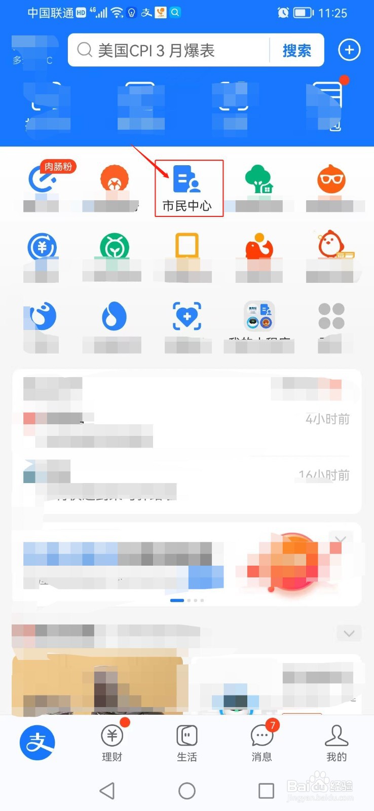 我们打开手机支付宝App,进入主页点击【市民中心】。