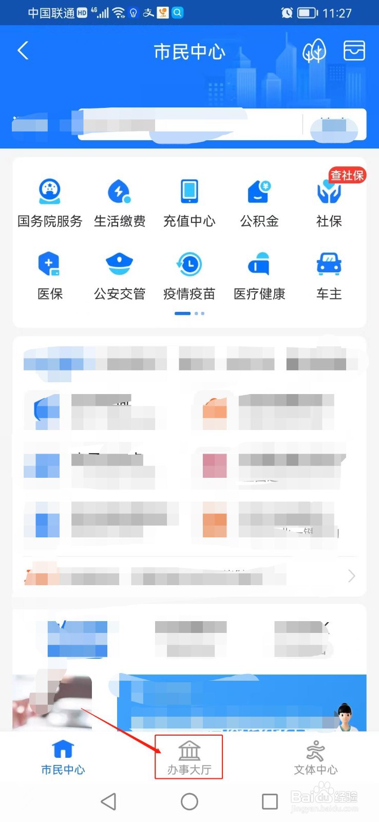 在市民中心页面,点击下方的【办事大厅】选项进入。