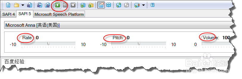 单击工具栏上的“播放”按钮进行测试,如果不满意的话,可以自己调整语速、语调、音量。
