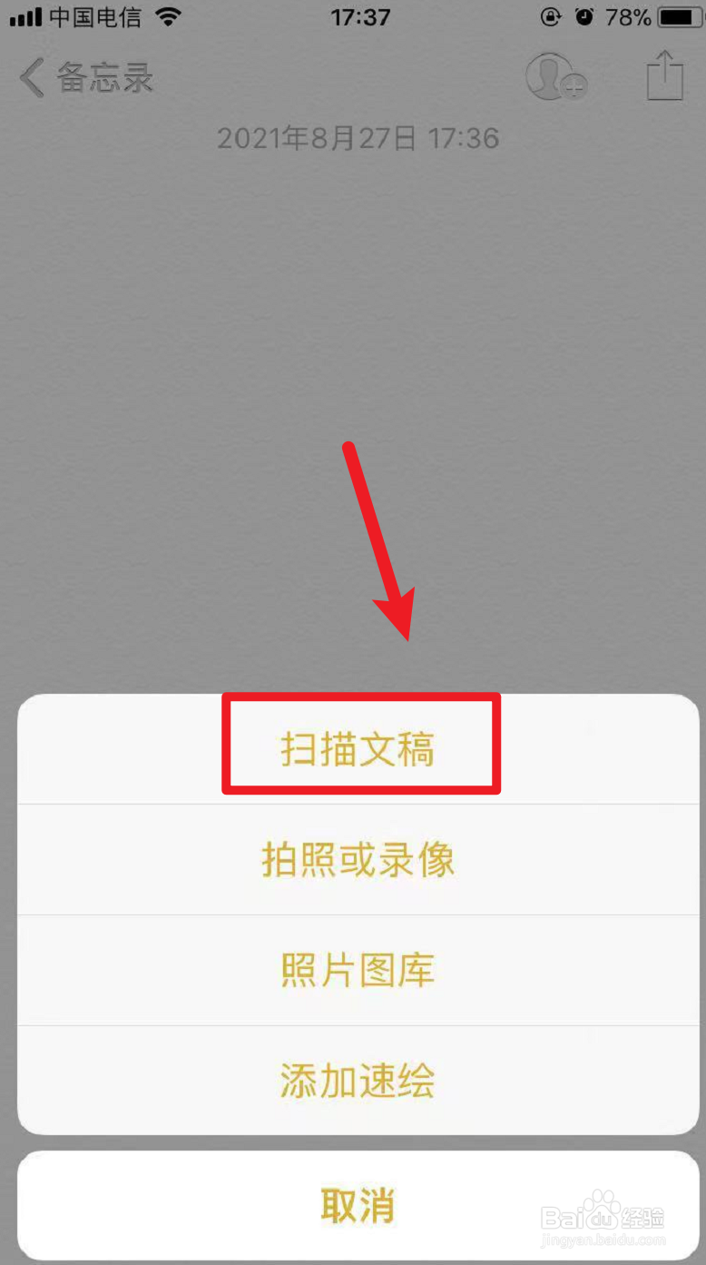 最后在编辑界面点击下方的+,在弹出的菜单中点击扫描文稿即可。