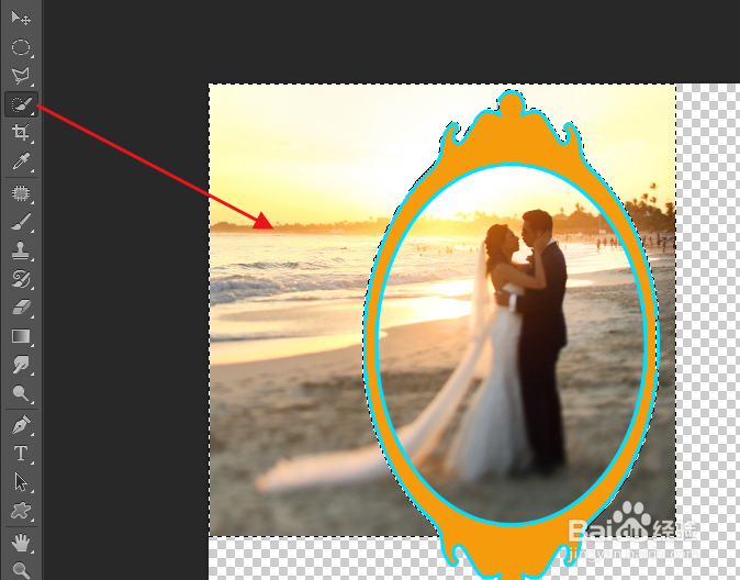 用快速选择工具选择边框以外的区域,然后点击键盘删除键。边框添加完成,