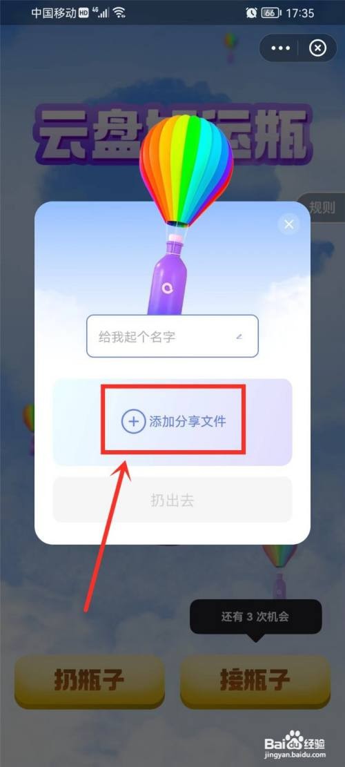 进入扔瓶子界面,点击“添加分享文件”图标。