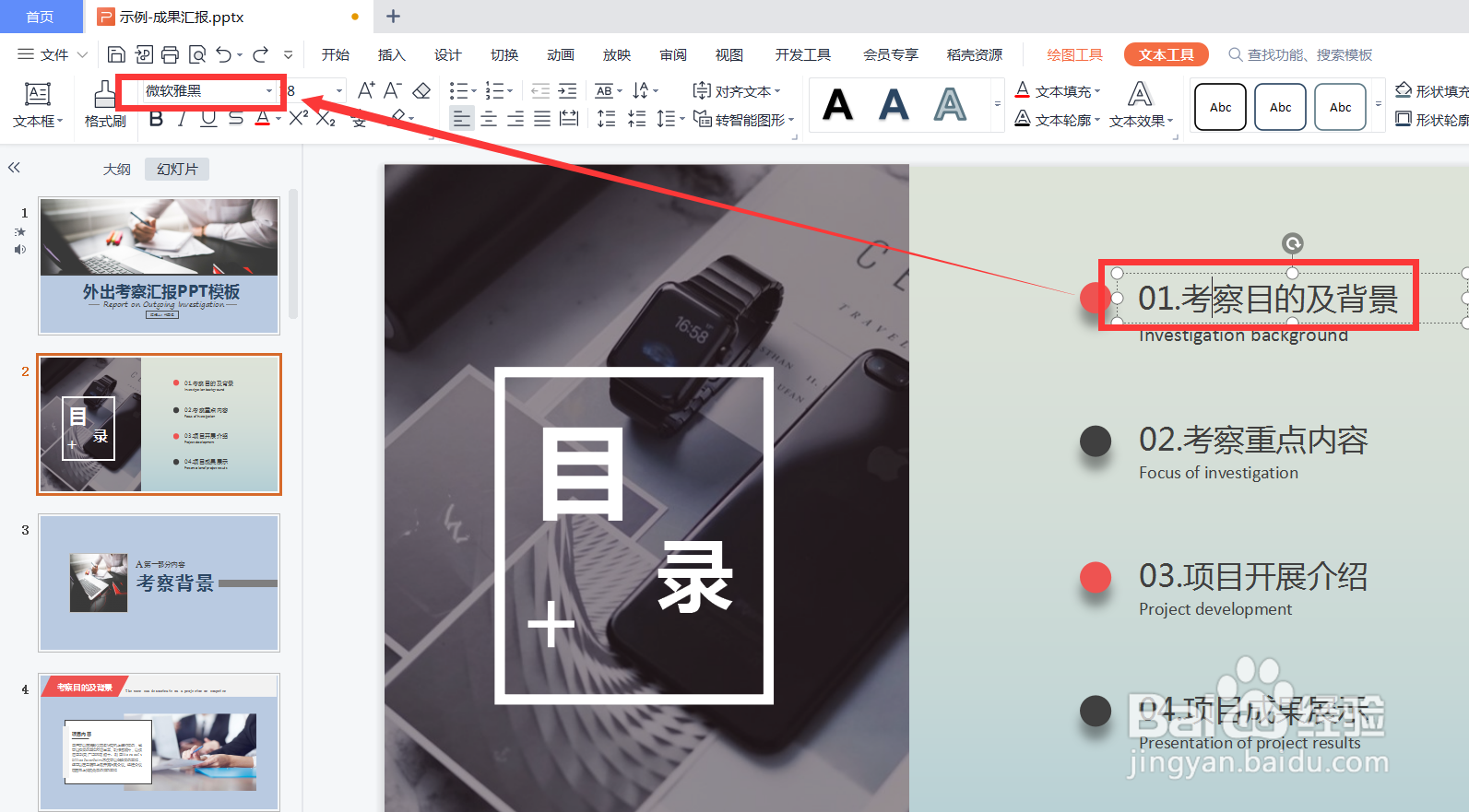 在wps中打开PPT文件,首先先点击你想替换的文字(先记住是哪种类型字体)