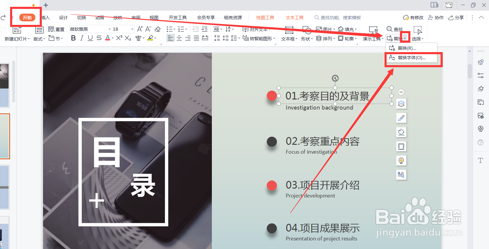 接着点击导航栏中的开始——替换后面的小三角形——替换字体