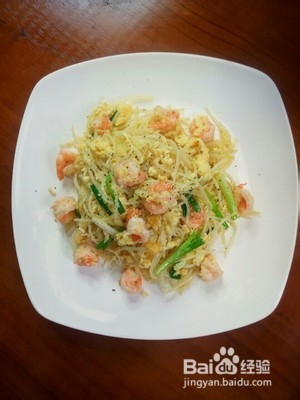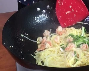 另起锅热油,油稍微多一些,火力要大,让锅气旺一些,先把虾仁炒至八层熟,下入芽菜翻炒几下,紧接立刻下入蛋液滑散,翻炒至鸡蛋凝结,立即放入葱段翻炒几下立即出锅装盘,整个过程也就一分钟左右,不能过分翻炒,否则芽菜会软烂出汁。