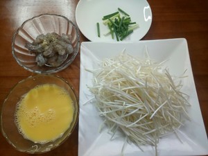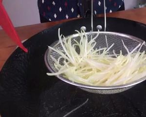 锅里烧开水,加点油和盐,芽菜过水半分钟,立即捞出控干水分备用。