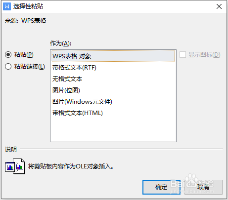 2.接着来到WPS文档,快捷键Ctrl+Alt+V,选择WPS表格 对象,点击确定,就完美转到文档里面了。