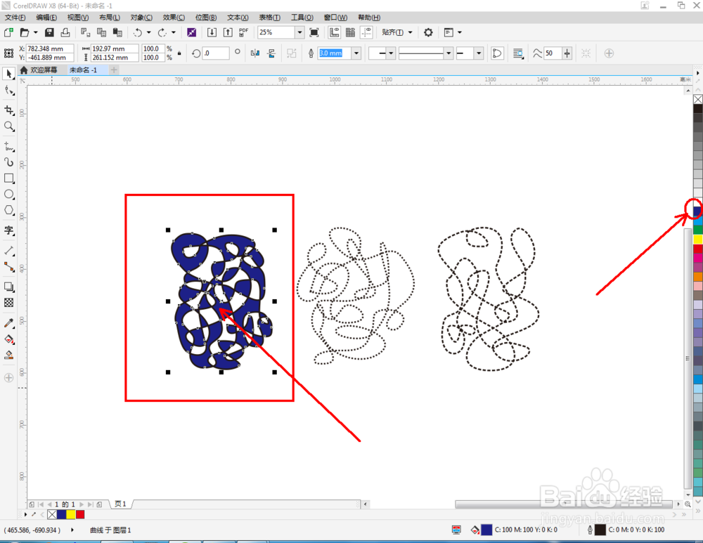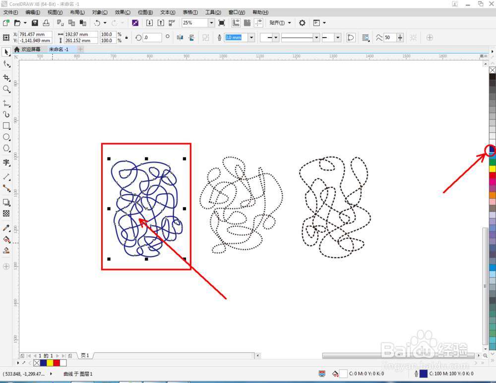 完成对手绘图案的属性设置后,编辑图案的线条颜色。点击图案1,鼠标右键点击右边色板中的蓝色,图案线条设置为蓝色。同样的步骤依次完成另外两个图案线条颜色的设置(如图所示);