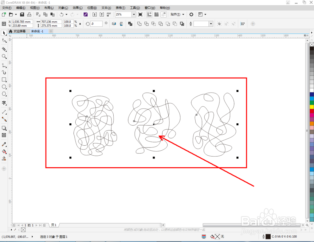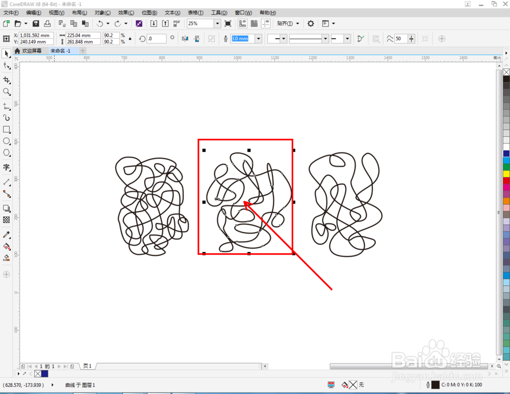 选中上述手绘工具制作的三个图案,点击上方【轮廓宽度】对图案的线宽进行设置,我们依次以1.5和3进行设置和对比(如图所示);