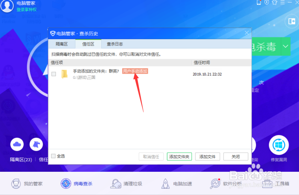 进入信任区之后,点击右下角的添加文件或者添加文件夹