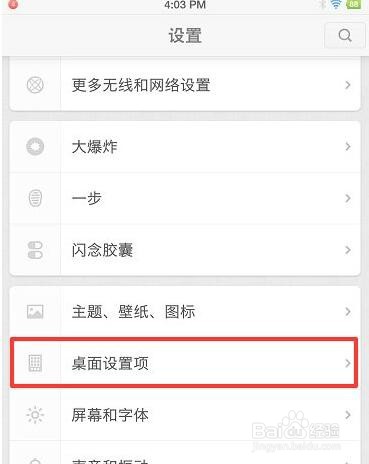 找到手机的设置图标进入,选择设置中的“桌面设置项”进入