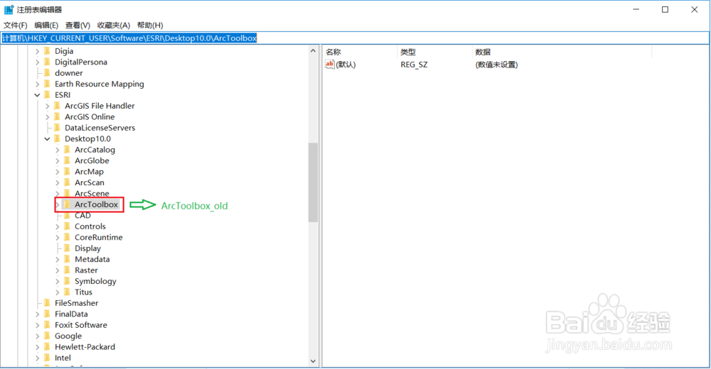 在注册表中找到ArcToolBox,大致位置是HKEY_CURRENT_USER\Software\ESRI\Desktop10.0\ArcToolbox,不同版本的软件,Desktop名称略有不同,按图中所示,将ArcToolbox重命名为ArcToolbox_old