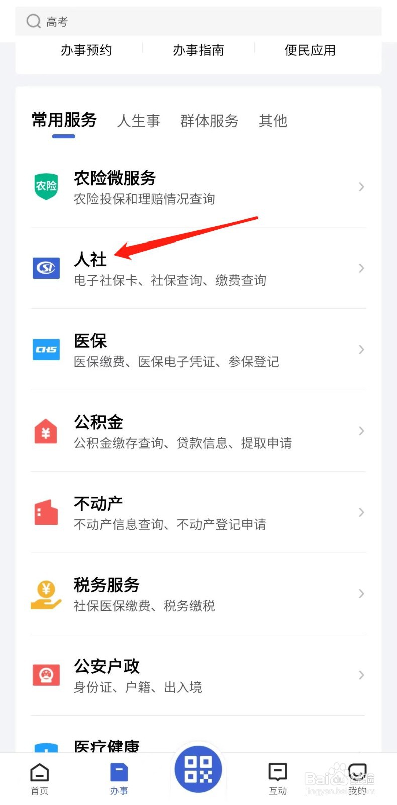 在常用服务列表点击“人社”选项,