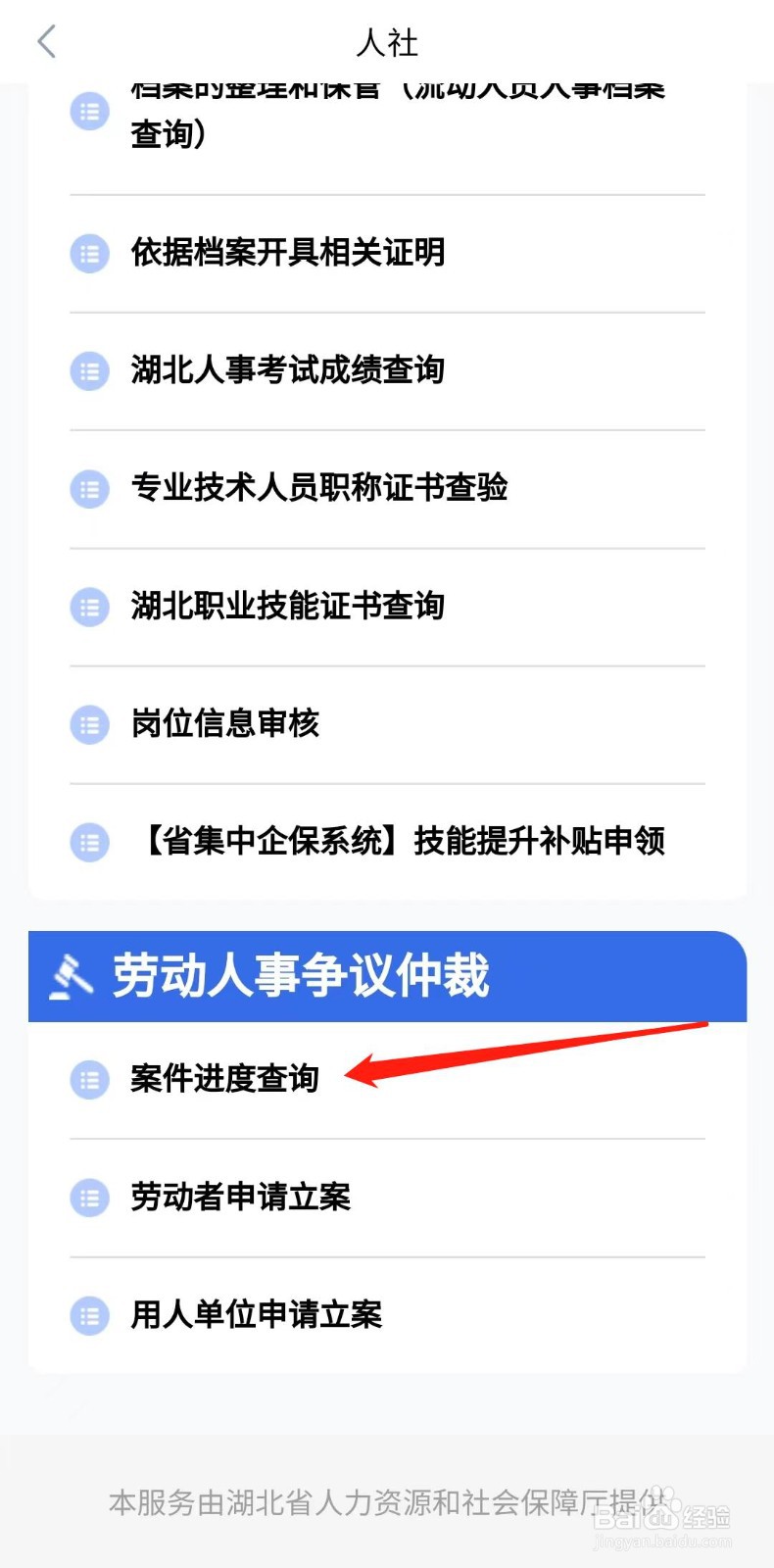 在劳动人事争议仲裁下,点击“案件进度查询”选项查询即可。