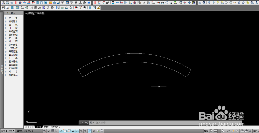 打开天正建筑,绘制一段弧形墙体,如下图所示