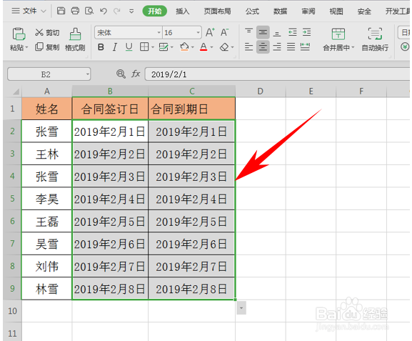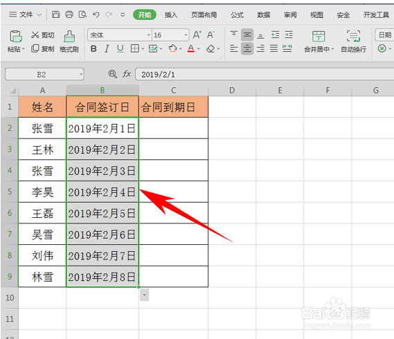 然后向右拖动,我们看到合同到期日的数据并没有变化,而是复制了过来。