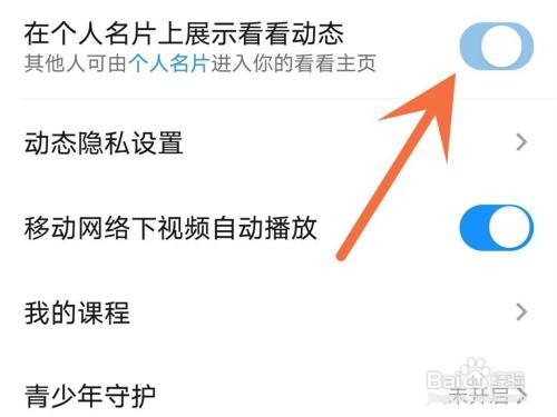 在新页面内,点击关闭【在个人名片上展示看看动态】。