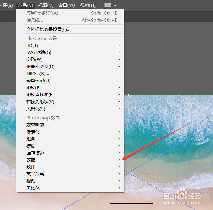 如箭头所示,在“效果”下选框中选择“素描”的右选标点击。