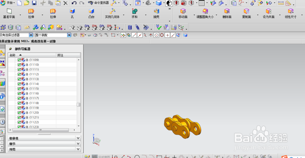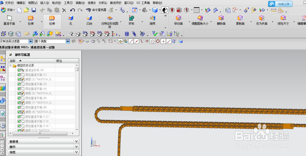 先画出一节链条,后面才能阵列几何体。如何画出一节链条,很简单,草图画出侧面轮廓,拉伸。多画几次草图就可以画出一节链条。