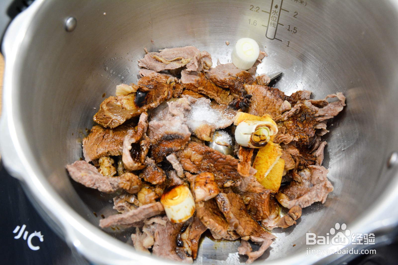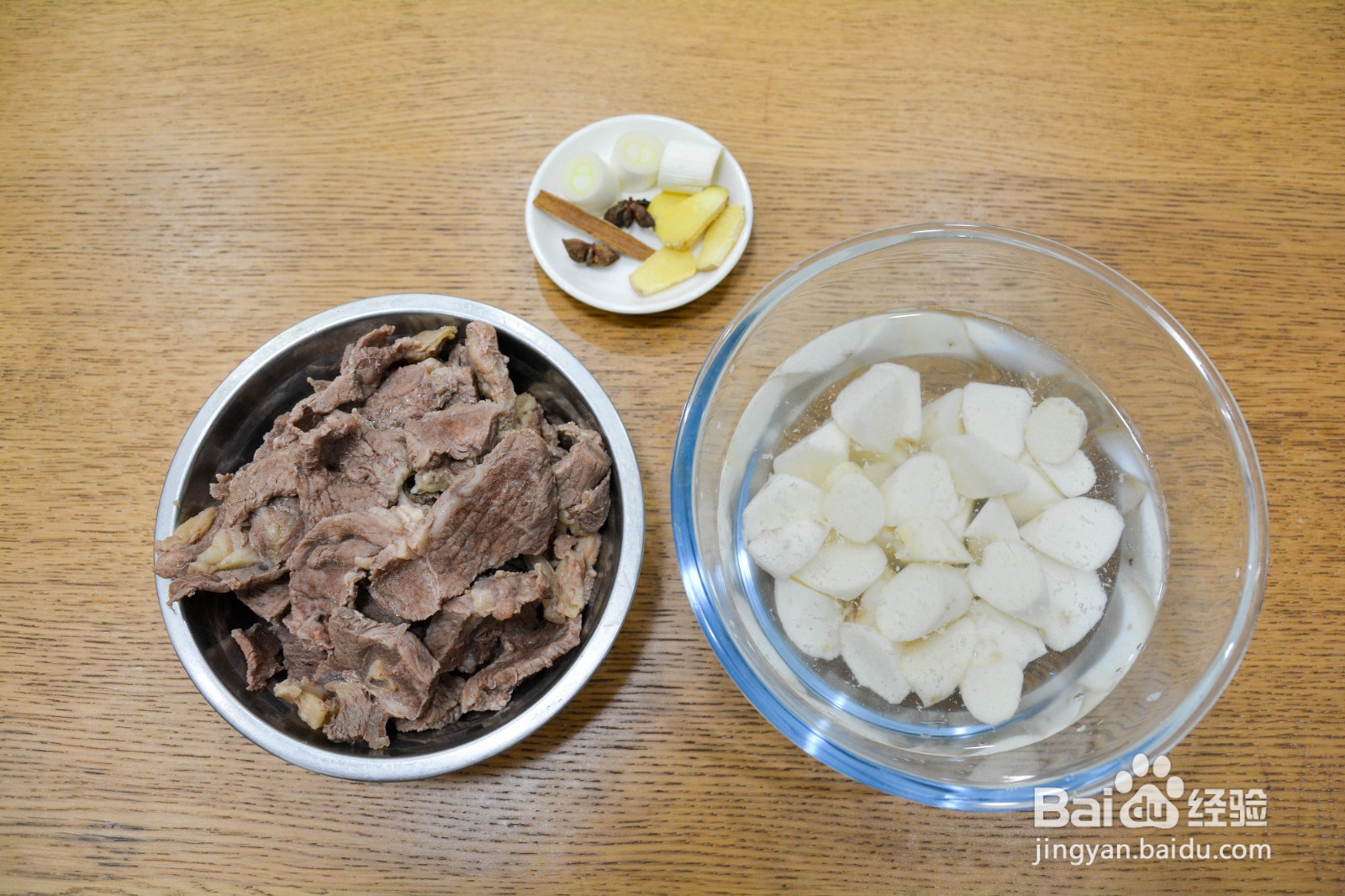 牛肉切厚片,入凉水锅煮变色捞出,如果血沫太多需用温水洗净;山药削皮,切栗子大小的块,用凉水浸泡防氧化变黑;葱切段,姜切片