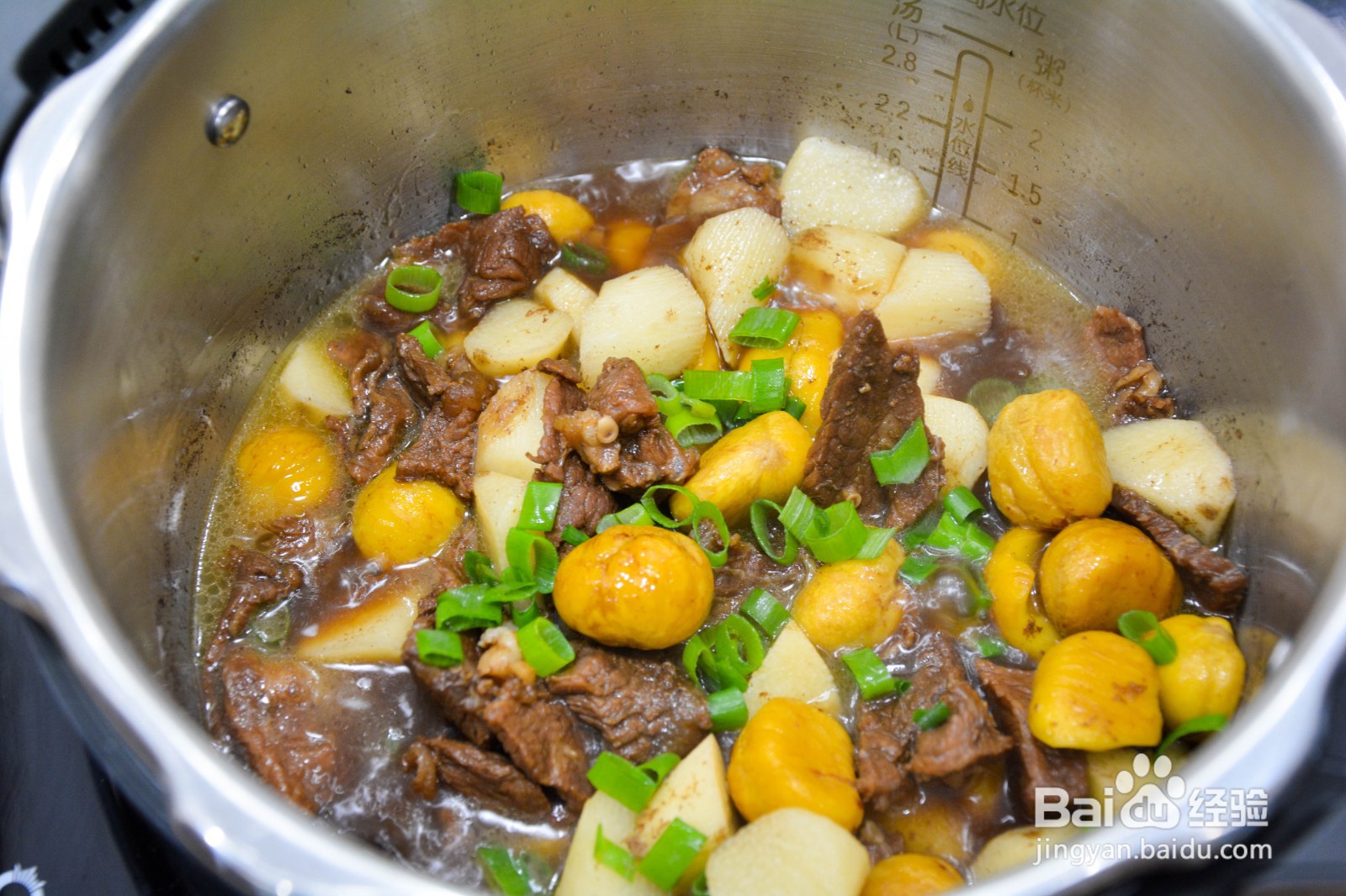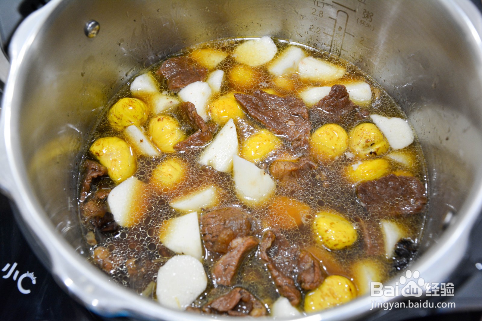 牛肉全熟,倒入栗子和山药,盖盖,中火焖炖15分钟,使栗子熟透还能收收汁,使汤汁更浓稠