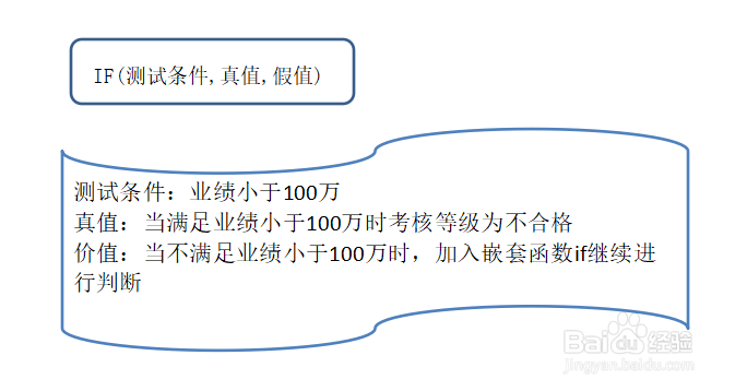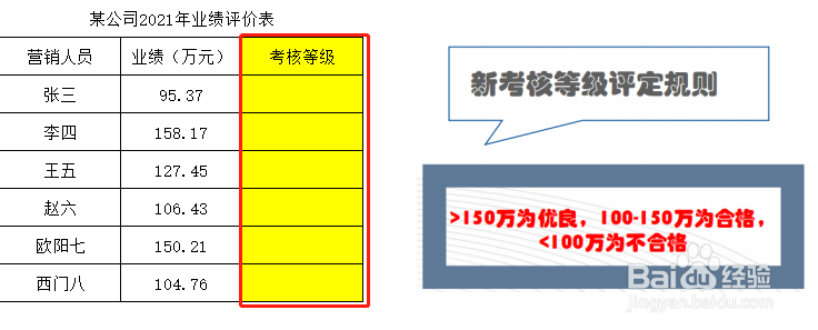 假如要根据以下条件判断每个营销人员的考核等级,这里就需要用到if函数。