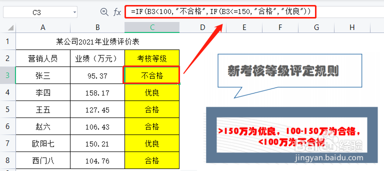 C3单元格输入公式:=IF(B3<100,"不合格",IF(B3<=150,"合格","优良")),即可得到最终的结果。