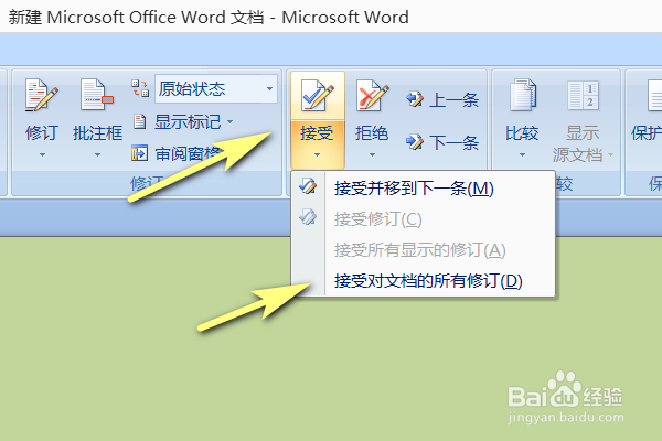 然后点击旁边的“接受”工具栏,在弹出的窗口中选择“接受对文档的所有修订”,这样就可以了。