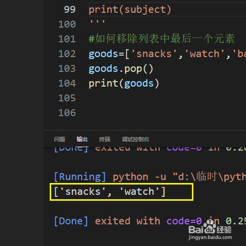 在输出控制台可以看到原来列表中的最后一个元素被删除了。