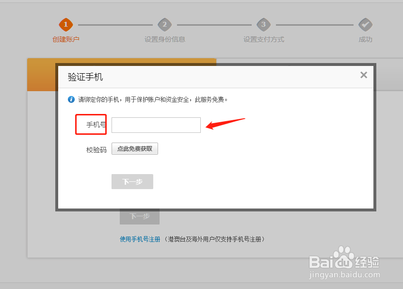 然后填了邮箱后,我们点下一步,它还是跳出叫你绑定手机号,所以,刚说了,一定要有一个手机号才能注册支付宝。