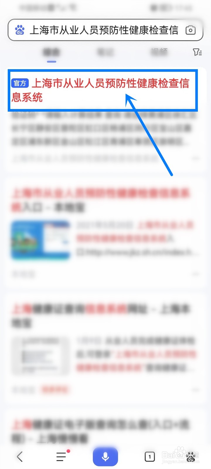 在百度搜索框输入“上海市从业人员预防性健康检查信息系统”,点击右侧“搜索”按钮。