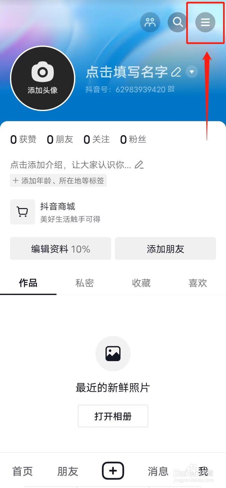 打开手机抖音app,点击主页右上角的三条横线;