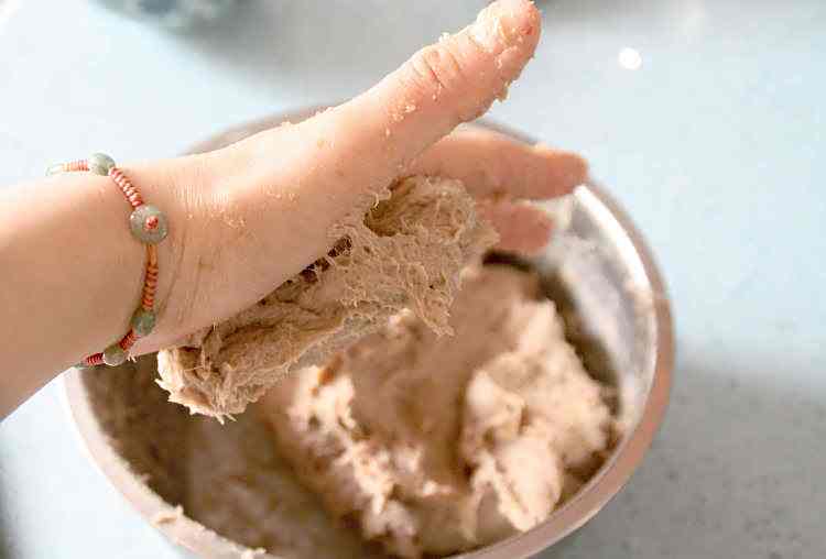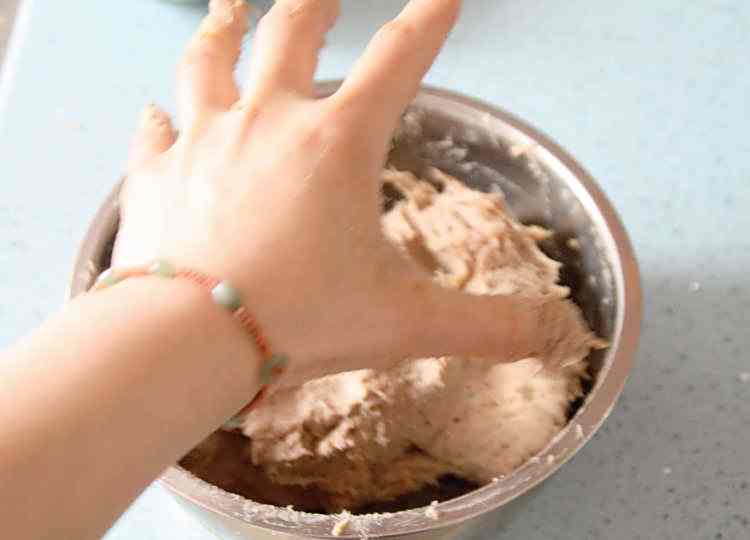 15、肉泥摔打上劲的标准,入图中所所示,取一团肉泥贴在掌心,翻转掌心向下,肉泥不会掉下来,基本上就可以了;