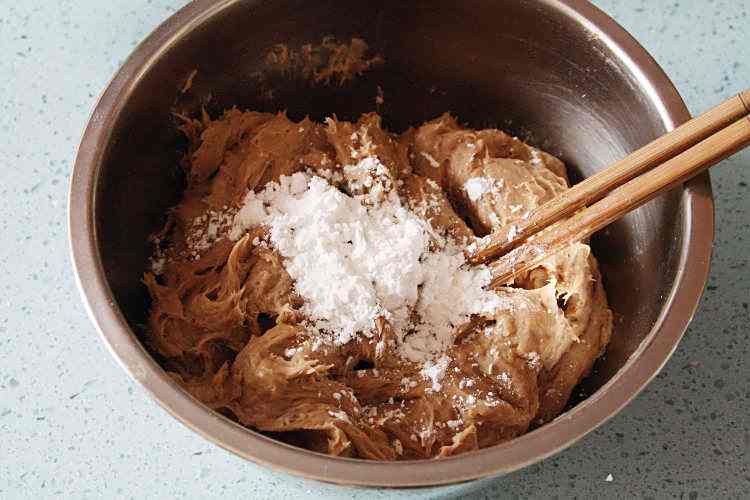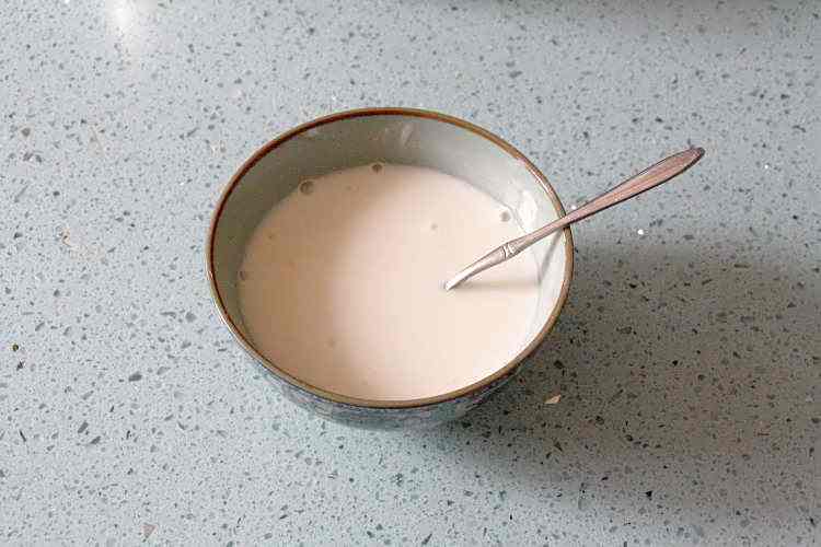 10、将2/3量的生粉与葱姜水混合,搅拌至没有干粉的状态;