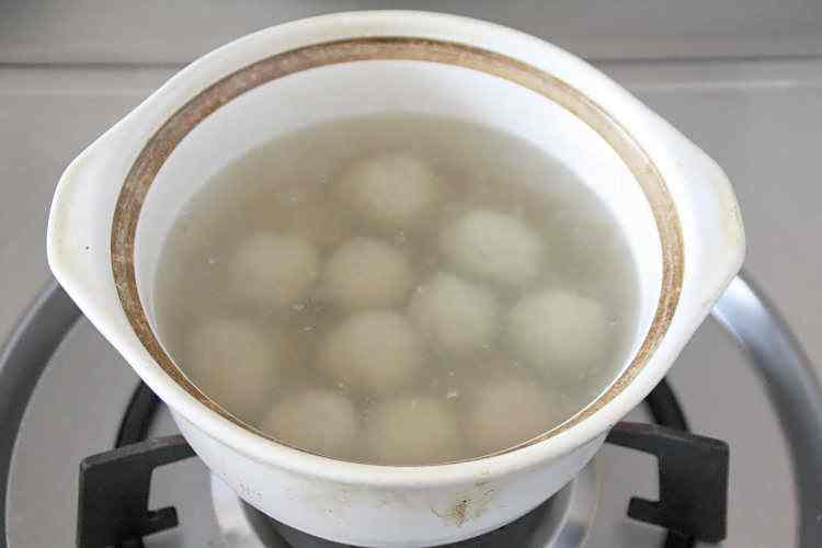 19、将勺子放入锅中,几秒中后肉丸会自动脱落。依次做完全部的肉丸,开中火,将肉丸慢慢养熟至浮起水面;