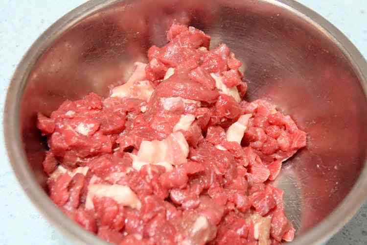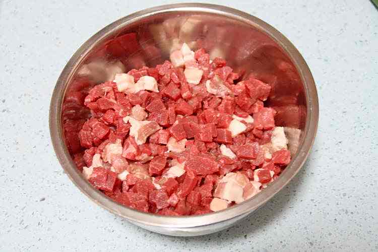 2、牛肉和猪肉洗净,提前浸泡2~3小时,去除一部分血水后,切成小肉丁;