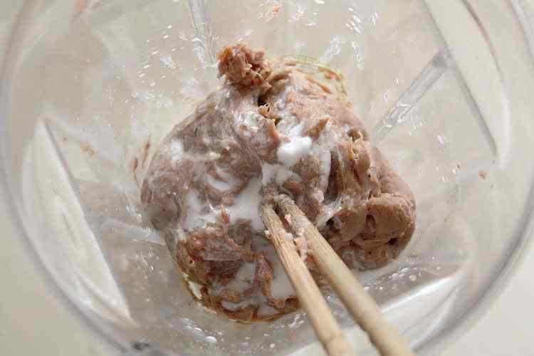 13、用筷子朝着一个方向快速搅打,至肉泥开始上劲抱团;