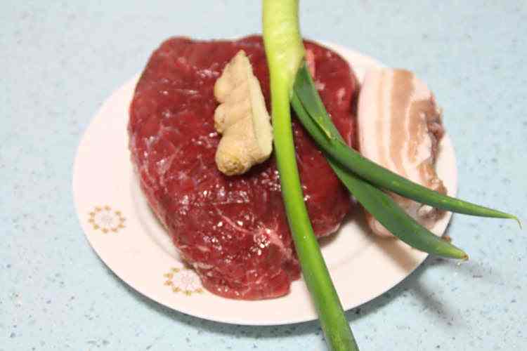 1、准备好牛肉,猪肉,葱姜;