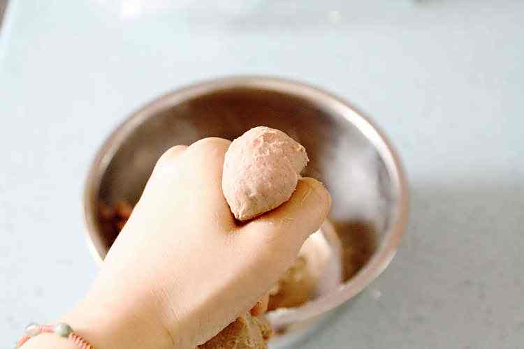 18、勺子上蘸些水,挖取一团圆形的肉丸;