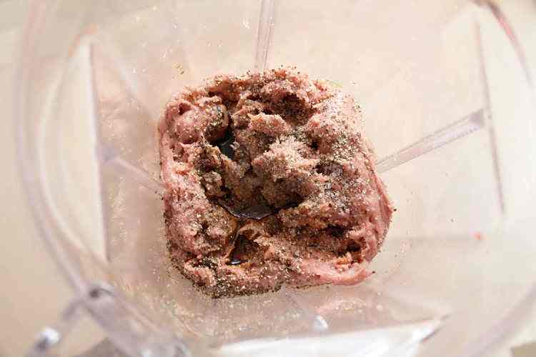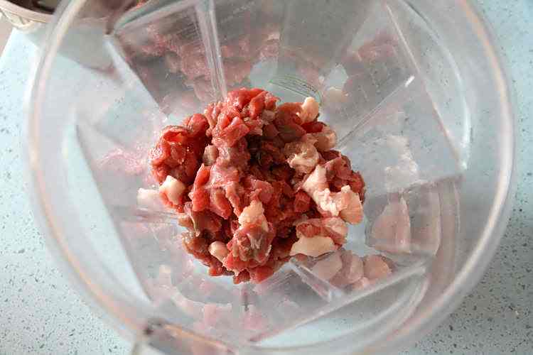 6、将冷藏好的肉丁放入料理机的搅拌桶中,如果量多,可以分次加工;