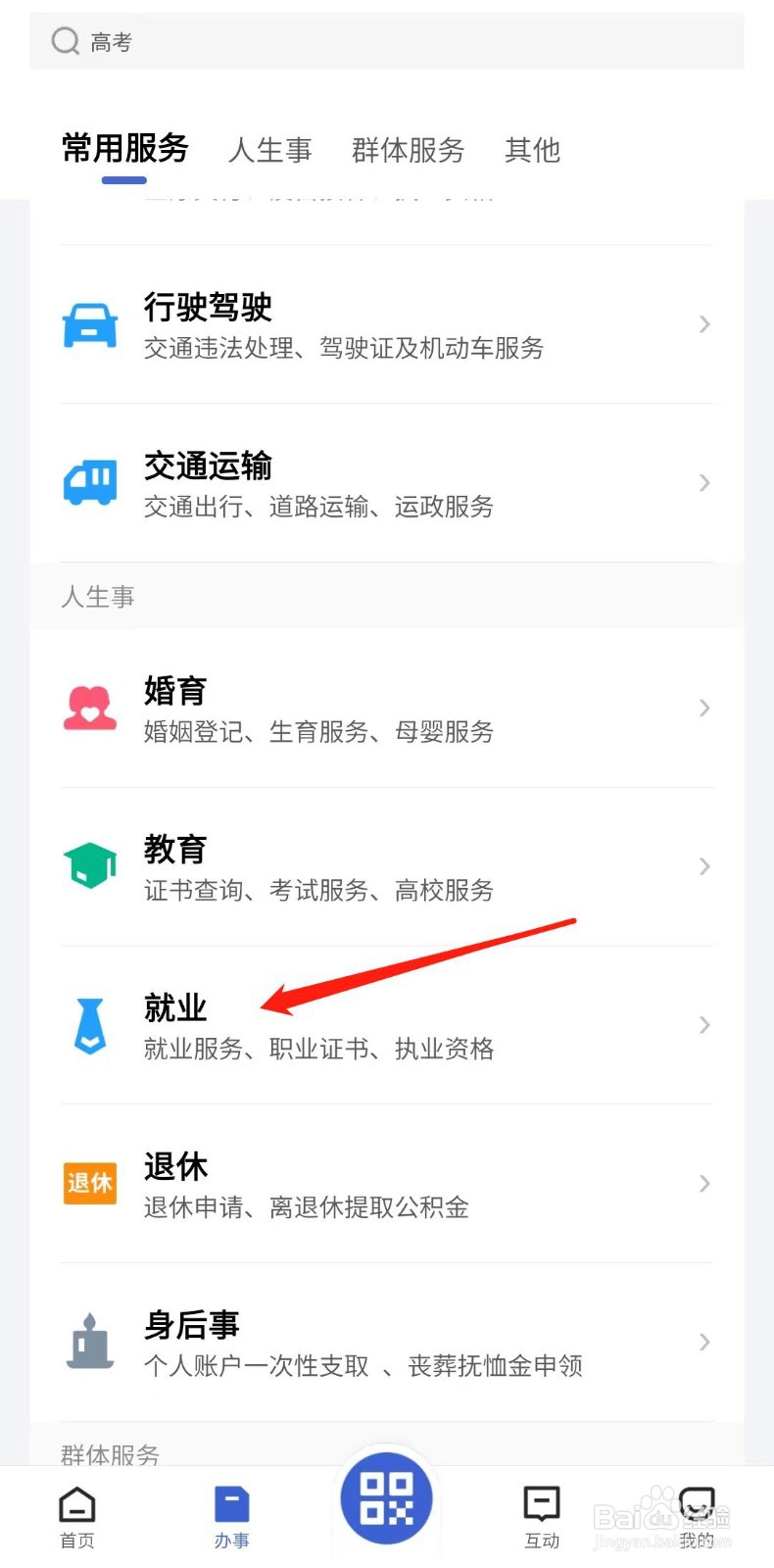 2/4在人生事列表下,点击“就业”选项;