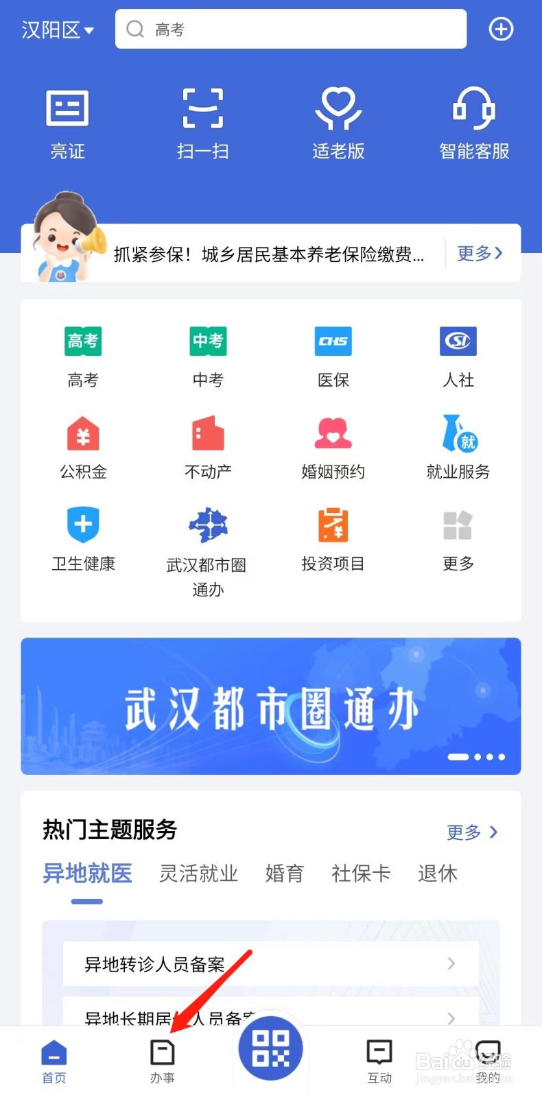 打开鄂汇办APP,点击底部的“办事”菜单;