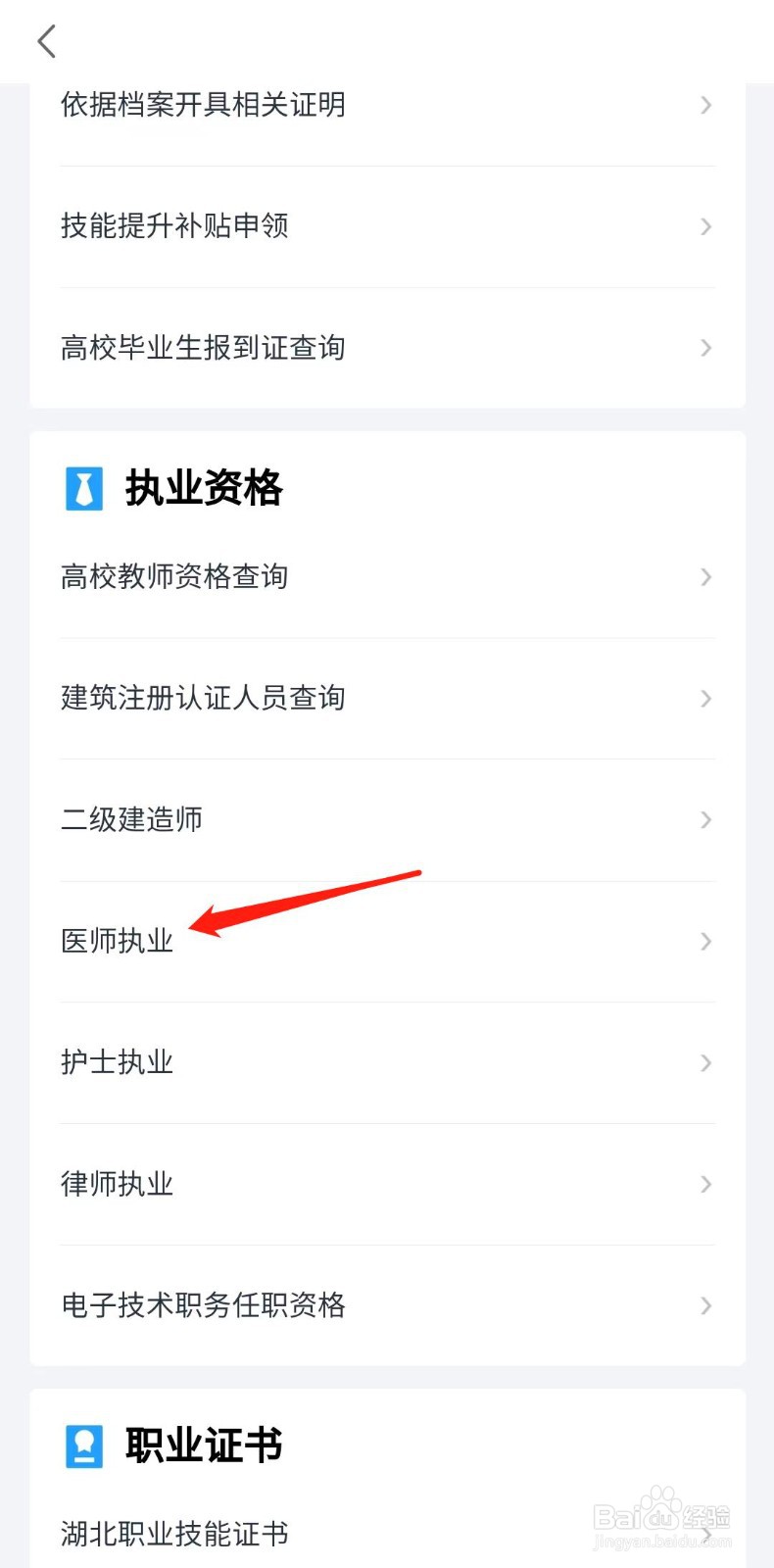 3/4在执业资格列表,点击“医师执业”选项;