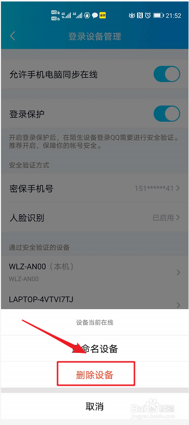 注意事项为安全起见,不常登录的设备可先将从设备列表中删除