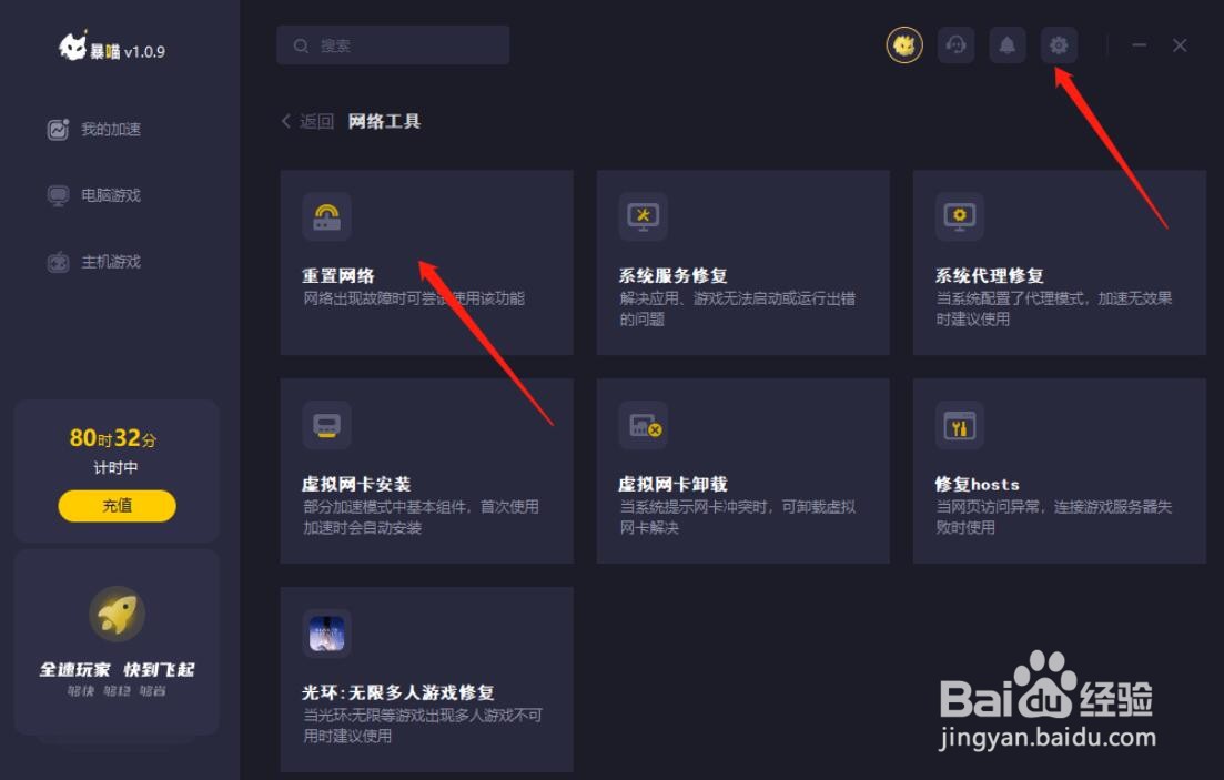 如果使用了加速器还是出现这个问题,可以尝试重置网络,点击暴喵加速器客户端右上角设置,选择网络工具,点击重置网络修复,重置后重启电脑即可;祝忌