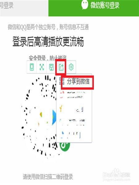 3/7点击【微信账号登录】,下面出现的不是二维码,无法扫码登,这个时候,把鼠标指向这个图标,上方出现一些图标,点击第四个图标,是分享到微信,点击一下【分享到微信】。